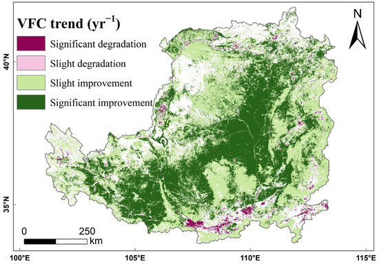 where n is the number of years, which is 18 in this study; fi represents the pixel value of the VFC of the ith year. The slope is the trend of VFC from 2000 to 2018. A slope of >0 indicates an increasing trend, while a slope of <0 represents a decreasing trend during the 18-year period. By referring to previous studies [54,55], the VFC trends were classified as significant degradation (−0.055 < slope < −0.003), slight degradation (−0.003 ≤ slope < 0), slight improvement (0 ≤ slope < 0.01) and significant improvement (0.01 ≤ slope < 0.06).