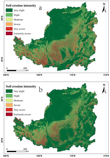 Distribution of soil erosion intensity in the Loess Plateau in (a) 2000 and (b) 2018.