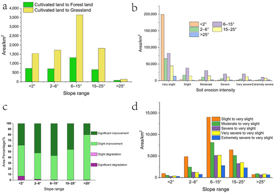 (a) Area of cultivated land converted to forest land and grassland for different slope ranges during 2000–2018. (b) Area of each soil erosion intensity class for different slope ranges in 2000. (c) Percentage of VFC change for different slope ranges during 2000–2018. (d) Area of each soil erosion intensity class above slight to very slight soil erosion for different slope ranges.