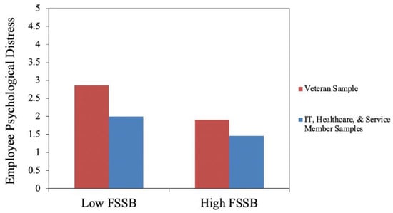 Interaction terms were added into the second model and effects were constrained across the groups to assess and compare the full vs. reduced model results for the reference group (i.e., Veteran sample) compared to the other three occupational categories. Results of the categorical moderation revealed the relationship between FSSB and psychological distress was significantly different for the Veteran sample compared to the other three occupational groups, as indicated by the significant ΔR2 = 0.002, (Δχ2 = 9.04, df = 3, p = 0.029), such that the negative relationship between employee reports of FSSB and psychological distress for those employees in the Veteran sample was significantly stronger compared to the other three samples. Results suggest Veteran employees reporting low FSSB from their civilian supervisors have significantly stronger reports of psychological distress compared to the other three samples, lending support to the importance of supervisors’ support for work–non-work lives of Veteran employees especially. Results of this analysis appear in Table 4. Figure 1 shows the relationship of these results across the association of FSSB and psychological distress for the Veteran sample compared to the other three groups. Additionally, when excluding the Veteran sample from model comparisons, there were no significant differences in the strength of the relationship between FSSB and psychological distress across the other three occupational populations samples.