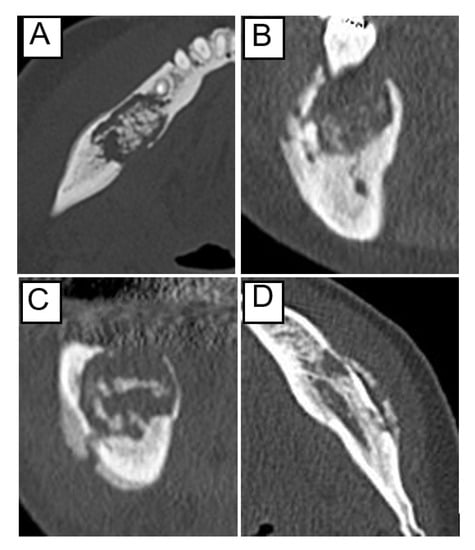 Examples of CT findings before treatment: (A) separation of the sequestrum, (B) osteolysis above the mandibular canal, (C) osteolysis including the mandibular canal, and (D) periosteal reaction.