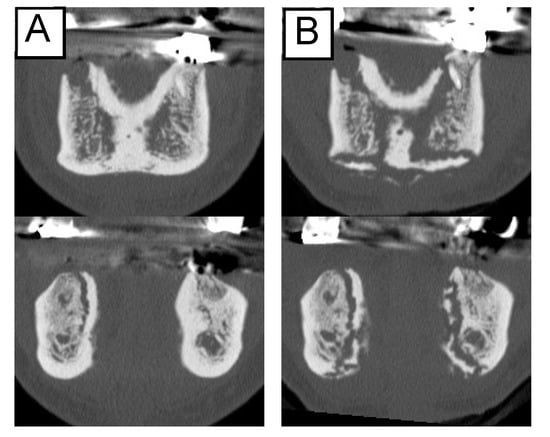 The goal of conservative treatment for MRONJ is to prevent the progression of the lesions and relieve clinical symptoms [,]. However, the lesions may sometimes grow rapidly during conservative treatment and may subsequently require larger invasive surgery. In this study, there were 15 patients whose clinical findings disappeared or improved; however, only two showed an improvement in their CT findings. Furthermore, although the clinical findings worsened in 6 patients, advanced lesions on CT examination were observed in 17 patients. It should be noted that although the clinical findings appeared to have improved, the lesions may have expanded during conservative therapy. Predicting whether conservative therapy will relieve symptoms or exacerbate the lesions will be of great benefit when choosing a treatment for MRONJ.