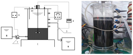 ASBR experimental device: 1: ASBR; 2: temperature controller; 3: solenoid valve; 4: time relay; 5: stirrer; 6: water-level meter; 7: peristaltic pump; 8: feeding tank; 9: effluent tank; 10: gas-sampling port.