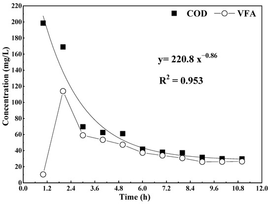 In Formula (1), dC/dt is the COD removal rate; t is the time; C is the COD concentration in ASBR. According to Formula (1), the COD removal reaction order of the reactor was determined as an approximate second-order, which was coincident with the characteristics of the anaerobic biological reaction that included fermentation reaction (acid production process) and methane production reaction [22]. According to Figure 3, the COD concentration of the ASBR decreased rapidly from 198.6 mg/L to 70 mg/L in the first 3 h, while the COD concentration had no obvious change after 8 h. In the first 3 h, the VFA concentration of the ASBR had a wavy change, and the maximum VFA accumulation concentration arrived at 113.6 mg/L. The anaerobic fermentation reaction was the dominant reaction in the ASBR at this time. It was demonstrated that the accumulation of VFA in the anaerobic fermentation reaction could be realized by controlling the reaction time as the first 3.6 h in one cycle.