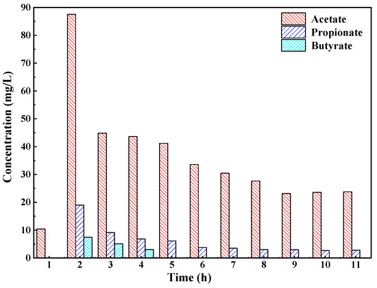 The composition and concentration changes of VFA in the reactor (HRT = 0.465 d) in one cycle are shown in Figure 4. The results showed that the VFA of the ASBR was composed of acetate, propionate and butyrate. No formic acid was detected in the experiment. Acetate and propionate were the main VFA components in the reactor, accounting for 80% and 15% of the VFA, respectively. It was reported that anammox bacteria had an affinity for acetate and propionate [25,26]. Therefore, the anaerobic fermentation reaction could be used as the decarbonization pretreatment process of the anammox reaction. From Figure 4, only a small amount of acetate existed in the initial stage of the experiment. In the 2nd hour, the concentrations of acetate, propionate and butyrate increased, reaching 87.5 mg/L, 19.0 mg/L and 7.44 mg/L, respectively. It was demonstrated that a certain amount of VFA accumulated at this time. However, the acetate in the reactor decreased rapidly by 50% in the 3rd hour, which was due to the gradual enhancement of the methanogenic reaction with the accumulation of acetate, resulting in the rapid consumption of acetate. In addition, the concentrations of propionate and butyrate gradually decreased in the reactor with the passage of time, and butyrate was not detected after the 5th hour. This was mainly due to the fact that the fermentation reaction further changed propionate and butyrate into a small molecule acetate, which was gradually consumed as the substrate of methanogenesis. In one cycle of the experiment, acetate was the main component of VFA, and its change trend was similar to that of the VFA in Figure 3.