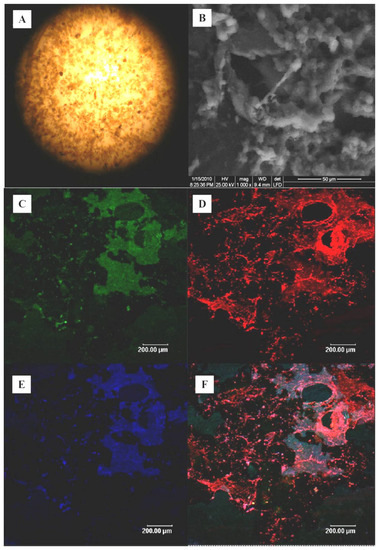 The photos of microbial flora analysis: (A) the microscope photos of seeding sludge; (B) the SEM images of bacteria on the 36th day; (C,D) the bacteria FISH analysis of ASBR on the 36th day: (C) Eubacteria; (D) Methanogens; (E) Acid-forming bacteria; (F) Superposition of three FISH images.