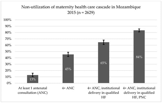 Apart from availability and accessibility, consistent utilization of a quality maternity health care cascade is key to decrease maternal and child mortality in countries such as Mozambique. The latest available data for Mozambique was derived from the survey conducted in 2015, which, being a population-based representative health survey, is considered the reference and most reliable measurement of maternity health service utilization. The survey captures women’s socioeconomic, demographic, health knowledge and seeking behavior covariates, which theoretically determine health care service utilization, as applied in similar studies [26,27,28,29].