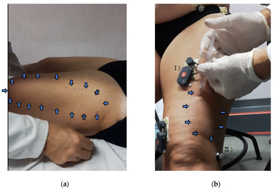 Evaluation (a) and treatment (b) of cutaneous area affected by nociplastic pain. (a) A paperclip was used to outline the painful skin area, marking with the black pen the area of transition from normal sensitivity to allodynia (the arrows highlight the black dotted lines that circumscribe the internal skin area affected by nociplastic pain). (b) Intradermal saline injections were performed for the treatment of the painful cutaneous area. (b-I) Surface-EMG; (b-II) reflective skin markers (medical devices used for 3D-gait analysis). Surface-EMG signal analysis are shown in the Supplementary files.