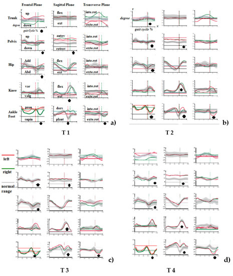 Trend of kinematic curves in three planes of motion before treatment at T0 (a), 5 min after treatment at T1 (b), after 5 days at T2 (c) and after 60 days at T3 (d). Each kinematic graph represents on the X-axis the percentage of gait cycle and on the Y-axis the motion degrees of each joint/body district (b). Figure note: black arrows indicate kinematic deviations from normal ranges at T0, and the improvement after treatment (at T1, T2, T3). Add (adduction); Abd (abduction); Var (varization); Valg (valgization); Pron (pronation); Supin (supination); flex (flexion); ext (extension); antev (anteversion); retrov (retroversion); dors (dorsiflexion); plant (plantiflexion); inte.rot (internal rotation); exte.rot (external rotation).