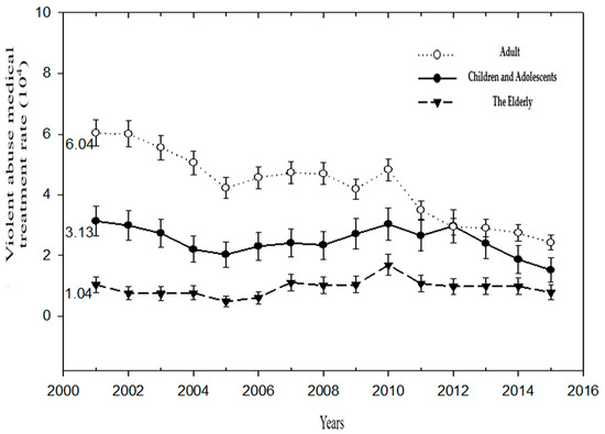 This study describes the distribution of trends in medical treatment in Taiwan from 2000 to 2015 due to factors related to a violent injury. The results determine that the crude rates of medical treatment in adulthood over the years were higher than those in children and older adults, and the standardized rates of medical treatment in adulthood were higher than those in children and older adults. The medical treatment rate of the adult generation is higher than that of children and older adults. The adult relative hazard ratio (RR) decreased from 2.38 in 2001 to 1.13 in 2014 (but the RR in 2014 was not significant). Changes in RR among children and adolescents were higher than in 2015, and the RRs from 2001 to 2014 ranged from 1.21 to 1.89. The change in RR of the older generation was lowest in 2005 (RR = 0.86 (95% CI = 0.53–1.40)) and highest in 2010 (RR = 2.54 (95% CI = 1.75–3.67)).