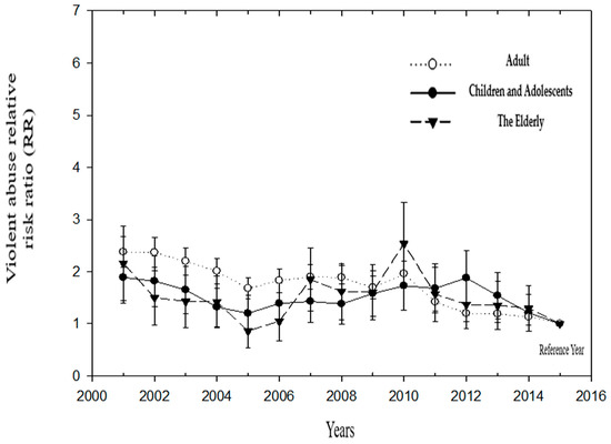 Relative risk ratios (RR) of Children and Adolescents, Adults, and The Elderly who were subjected to violence to seek medical treatment over the years.