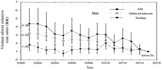 The relative hazard ratio (RR) of seeking medical treatment for violence in children, adults, and the elderly over the years (Male) (Reference group: 2015).