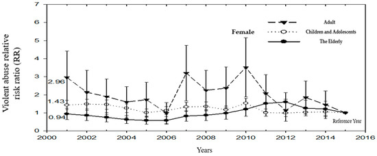 Relative hazard ratio (RR) of Children and Adolescents, Adults, and The Elderly who were subjected to violence to seek medical treatment over the years (Female).