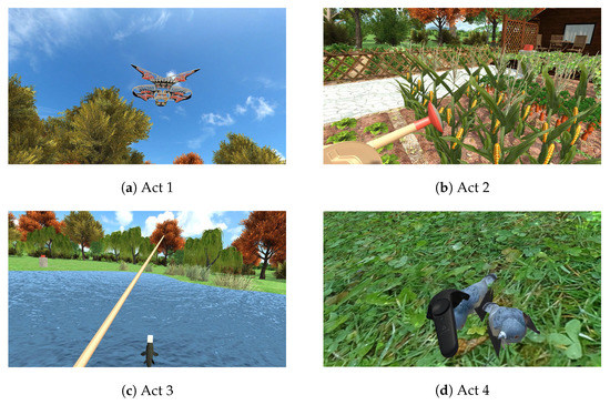 A 2 (anxiety and depression state) × 4 (interactive VR scenarios) experimental design was used. The anxiety and depression state was the between-subjects variable, divided into Group 1 (the mild to moderate anxiety and depression group) and Group 2 (the other). The interactive VR scenarios were the within-subjects variable, including flying a kite in the lawn area (Act 1), watering vegetables in the gardening area (Act 2), fishing in the water area (Act 3), and feeding birds in the forest area (Act 4). A completely randomized design was used to control the effects of order effects, experimental environment, and individual differences. Specifically, to ensure that the VR scenarios for the current experiment were presented in a completely random order, scenario selection was based on the built-in python command for random integer generation.