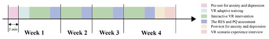 Participants experienced the VR intervention once a week and took up to a month to complete, as shown in Figure 2. They signed an informed consent form and completed a pre-test for anxiety and depression, as well as VR adaptive training in the first week. The STAI and SDS were filled out in the pre-test. The operation of the headset and handles was learned in the VR adaptive training. They adjusted the tightness, focal length, and pupillary distance of the headset, to ensure the vision field was clear and blur-free. Moreover, participants would be able to use the handles smoothly, defined as entering the VR scenario and completing the commands “forward, backward, momentary movement and pulling the trigger” with a score of 3 or more each (5-point, assessed by people with sufficient operational experience). In addition, participants would be able to smoothly use handles, which is defined as entering a VR scenario and completing the commands “forward, backward, move left, move right, teleportation and press the trigger”, scoring 3 or more on each item (a 5-point Likert scale, assessed by someone with sufficient operational experience). The participants then experience the VR scenario for 8–10 min once a week for 4 sessions. When the experience was complete, they filled in the RES and PQ if they were in a good state, or after a break if they felt motion sickness. At the fourth week, participants completed the post-test for anxiety and depression and were invited to participate in a VR scenario experience interview, where they were asked “How did you feel in VR and what impression did each scenario leave on you?”.