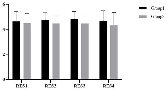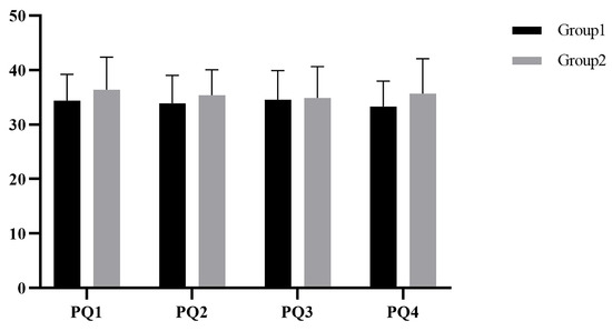 SPSS 25 was used for statistical analysis, and the Kolmogorov–Smirnov test showed that scores were normally distributed. The scores of the restorative environment in group1 and group2 are shown in Figure 3. Repeated-measures ANOVA was used to compare restoration in the four experiments. After chi-squared and sphericity tests, there was no significant difference in the restorative environment scores between the two groups, F(1,16) = 0.989, p = 0.335. There was no significant difference in the restorative environment scores within groups, F(3,48) = 0.383, p = 0.766.