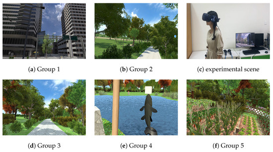 VR scenarios in Study 2, (a) automatic viewing the urban environment, (b) automatic viewing the park environment, (c) experimental scene, (d) free-roaming in the park environment, (e) fishing in the park environment, and (f) watering in the park environment.