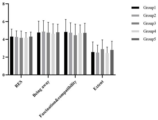 SPSS 25 was used for statistical analysis, the restorative environment scores conformed to a normal distribution by the K-S test. The descriptive statistics of the total score and their dimensional scores are shown in Figure 7. The one-way ANOVA showed that there were no group differences among the five groups, F(4,164) = 0.348, p = 0.845.