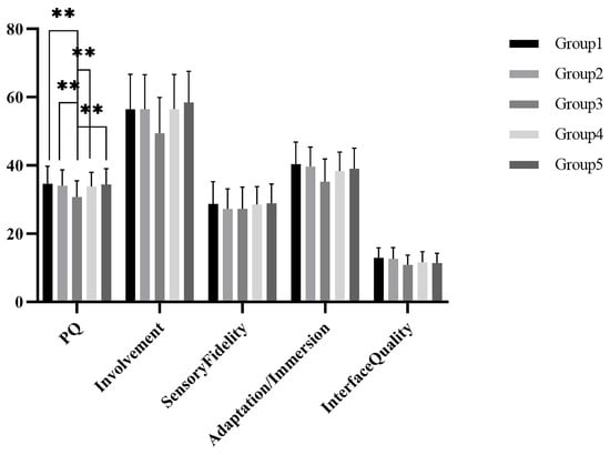 The results of the descriptive statistics of the total score and its dimensional scores are shown in Figure 8. A one-way ANOVA revealed that there was a significant difference in presence among the five groups, F(4,174) = 4.093, p = 0.003. A further LSD post hoc test revealed that there was a significant difference between Group 1 and Group 3, t(1) = 3.513, p = 0.001; the difference between Group 2 and Group 3 was significant, t(1) = 2.946, p = 0.004; the difference between Group 3 and Group 4 was significant, t(1) = −2.767, p = 0.006; the difference between Group 3 and Group 5 was significant, t(1) = −3.327, p = 0.001.