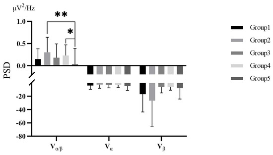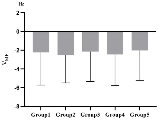 The EEG and EMG data were analyzed by SPSS 25 after the K–S test conforming to a normal distribution. The descriptive results of changes in the relative power spectral density ratios of and waves () and the changes in median frequency of EMG () are shown in Figure 9 and Figure 10.