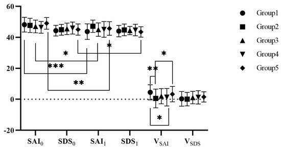 Descriptive statistics of the pre-test (, , and in the first experiment) and post-test (, , and in the fourth experiment) on the anxiety and depression scores for group1 and group2 are shown in Figure 5. Paired t-test was used to compare the difference between the pre-test and the post-test. As for Group 1, there was no significant difference between and , t(11) = 0.573, p = 0.578; there was no significant difference between and , t(11) = −0.062, p = 0.952; there was significant difference between and , t(11) = 2.799, p = 0.017. As for Group 2, there was significant difference between and , t(7) = −2.638, p = 0.033; there was no significant difference between and , t(7) = −1.986, p = 0.087; there was no significant difference between and , t(7) = −2.308, p = 0.054.