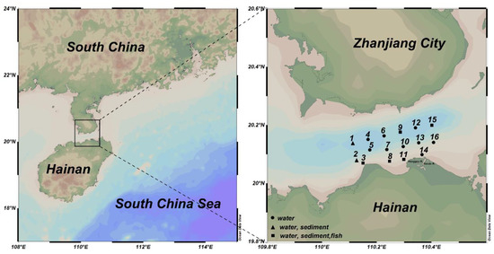 In April 2016, a total of 16 sampling points for a water quality survey were set up in Haikou Bay and the adjacent sea areas (110°06′41.34″~110°24′51.90″ E, 20°02′42.30″~20°12′04.80″ N) with seven sampling points for sediment surveys; in May of the same year, five sampling points for a fish quality survey were set up (Figure 1). The water samples from both 2 m below the surface and 2 m above the seafloor were collected using a Niskin sampler (General Oceanics, Miami, FL, USA). The water samples for metal determination were filtered immediately through a 0.45-μm pore glass fiber filter (GF/F, Whatman) and acidified with nitric acid to pH 1.5–2.0 for preparation for analysis. The filters and the water samples were stored in a −20 °C refrigerator. Suspended particulate material (SS) samples were filtered through pre-weighed Whatman GF/F fiber filters (25 mm). The SS samples were dried and weighed to determine the amount in mg/L of sample. The seawater for dissolved oxygen (DO) analysis was collected with a tube reaching the bottom of the bottle until the water overflowed. DO was determined using the Winkler titration method according to Gao and Song (2008) [25] just after sampling. The seawater temperature and salinity were measured in situ with a multiparameter sensor YSI6600, and pH values were determined with a pH meter. Active phosphorus (AP) was measured using the approach according to Valderrama (1981).