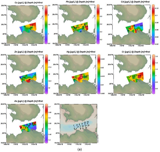 The vertical distribution of these heavy metal elements, except for Zn and Cd, showed high concentrations in the surface water and low concentrations in the bottom water. Combined with the background trend of seawater salinity gradually increasing from surface to bottom in this study area, these findings were consistent with Wang et al. (2007) [35], who indicated that the concentration of heavy metals decreased with the increase of seawater salinity.