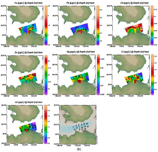 Spatial distribution of concentrations of seven trace metals in surface and bottom water bodies ((a) is the surface layer; (b) is the bottom layer).