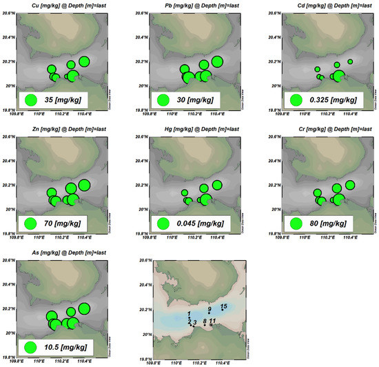 The distributions of seven heavy metals in the surface sediments in Haikou Bay and adjacent sea areas are shown in Figure 3. The analysis results showed that the concentrations of heavy metals in the surface sediments at all stations meet the first-class standards for the National Marine Sediment Quality of China. The Cd gradually decreased from the nearshore to the far sea, while the spatial distribution characteristics of the other heavy metal elements were high in the east and low in the west. The high-value areas were distributed in the Nandu River Delta and the downstream area of the Henggou River estuary. The maximum concentrations appeared at the sampling point 11, which may be related to the fact that the sampling point 11 is located at the mouth of the Henggou River. The river’s aperture flow is supported by rising tides and waves, the runoff velocity is weakened, and the land-based source pollutants carried and migrated by the runoff are silted up here.