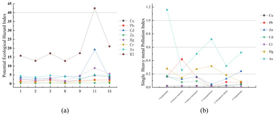 The single-factor pollution index method was used to evaluate the pollution degree of seven heavy metals in the sediments of the study area. The analysis results were shown in Table 6. From the statistical results of the heavy metal single-factor pollution index (), the pollution index of each element was less than 1.0, indicating that the overall pollution level in this study area was low. However, the of elements Cu and Cr at the sampling point HS11 were as high as 0.95 and 0.97, respectively, which nearly breaches the safety value of 1.0 (Figure 4a). The contamination degree displayed by the mean value from low to high is Hg < Cd < Zn < Pb < As < Cr < Cu. Moreover, the comprehensive pollution index () evaluation results showed that the degree of pollution in the study area was at a low pollution level as a whole. The highest value of (4.20) appeared at the sampling station HS11 with a low degree of pollution, and the contribution rate of Cu and Cr was high, nearly 50%, while the proportion of other elements was relatively low.