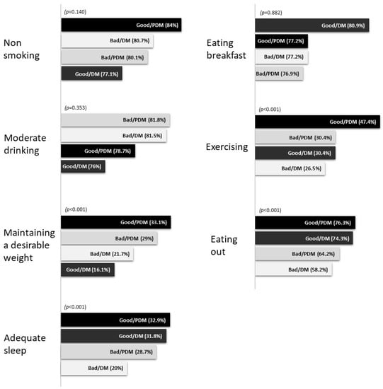 The proportion of those with a normal weight was the highest in the Good/PDM group (33.1%), followed by the Bad/PDM (29%), Bad/DM (21.7%), and Good/DM (16.1%) groups. The proportion of those reporting adequate sleep was the highest in the Good/PDM group (32.9%), followed by the Good/DM (31.8%), Good/PDM (28.7%), and Bad/DM (20%) groups. The proportion of those exercising for an adequate time was the highest in the Good/PDM group (47.4%), followed by the Bad/PDM (30.4%), Good/DM (30.4%), and Bad/DM (26.5%) groups. The proportion of those eating out less was the highest in the Bad/PDM group (76.3%), followed by the Bad/DM (74.3%), Good/DM (64.2%), and Good/PDM (58.2%) groups.
