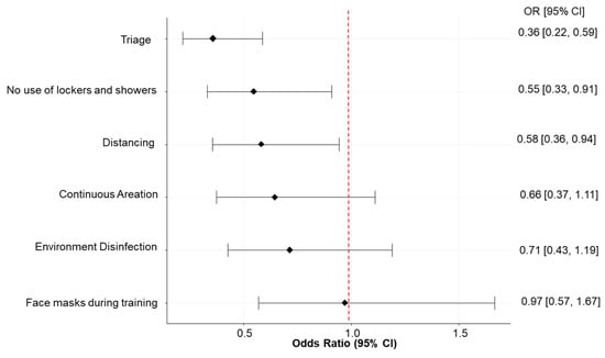 After adjusting for athletes’ characteristics and sport-related covariates, we found that the most effective preventive measure reported in the questionnaire was to perform a triage (i.e., measuring fever and account for other symptoms and contact tracing), which reduced the risk of being infected by approximately 64% (OR; 95% CI: 0.36; 0.22–0.59, Figure 1). The other effective measures were avoiding the use of lockers and showers, which reduced the risk of being infected by approximately 45% (OR; 95% CI: 0.55; 0.33–0.91). Distancing and aeration were also associated with a significant risk reduction in multivariable analysis (Supplementary Table S4). The percentage of reported SARS-CoV-2 positivity was similar among different sports (p = 0.17, Supplementary Figure S3).