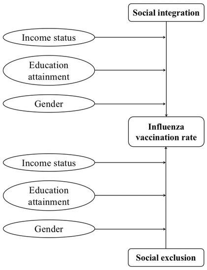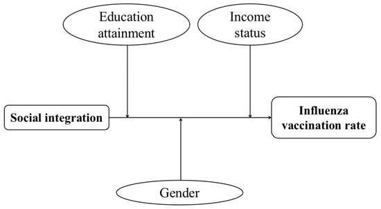 Previous studies have also pointed out that there were associations between gender, income, education level, and social integration, as well as social exclusion status [33,34,35,36], which may have an impact on a model including these variables and influenza vaccination rate. Regarding gender, research showed that gender may influence the vaccination rates. Men were more likely to become vaccinated while females may care more about the efficacy and safety of the vaccine [36]. Thus, we hypothesize that male migrants are more likely to be affected by social integration and social exclusion, as suggested by the following hypotheses: