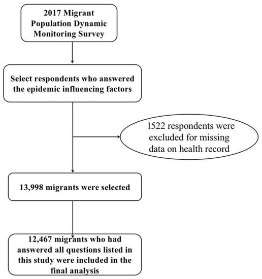 Participants in this survey were the migrants who lived in one destination city for more than one month. Each village and neighborhood committee in the sample shall, according to the survey group determined by the state for each sample point, check all the floating population (the sample points of scattered residence types shall be reported to all the current members of 50 migrants’ households) in their households and fill them in on the national sampling platform. In case the respondents cannot be visited during the formal survey, the investigators of each sample point can apply on the national sampling platform, and the country will replace them according to the principle of “the same sex, the same age, and the same residence time”. In principle, the replacement personnel shall be found in the report roster. If there is no suitable replacement object, it shall be expanded to the scope of the village (neighborhood) committee. All of the above information was from the technical documents of 2017 migration population dynamic monitoring survey (MDMS), which needs to be downloaded from the online website in PDF version for reading (https://www.ncmi.cn/phda/dataDetails.do?id=CSTR:A0006.11.A000T.201906.000225) (accessed on 6 June 2019).