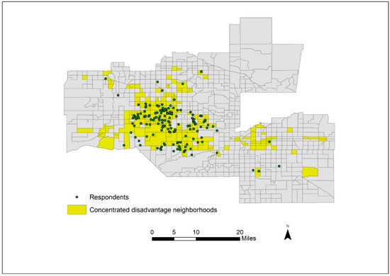 In terms of neighborhood sociodemographic characteristics we included the gross median monthly rent (scaled in $100 dollars), low-income tract status designation (indicated by at least 20% of households being impoverished), the percentage of residents who lived below the federal poverty line, the unemployment percentage, the percentage of residents who were college graduates, and the percentage of residents who self-identified as Hispanic/Latino. We also included two composite indices. The first measure, concentrated neighborhood disadvantage, is a composite index of poverty consistent with the previous research [53,54]. This index was comprised of: (1) the percentage of individuals below the poverty line; (2) the percentage of individuals on public assistance; (3) the percentage of female-headed households; (4) the percentage unemployed; and (5) the percentage under 18 years of age. These percentiles were z-score transformed (i.e., standardized across Maricopa County, Arizona, where the Phoenix metro area is located) and then averaged into an index to represent the extent of deprivation. Consistent with previous research [53,54], cut-offs were then applied to these indices at the 75th percentile to identify areas of high concentrated disadvantage. The second composite index, from the Arizona Healthy Community Map, measures tract health based on 12 domains such as access to care, affordable quality housing, community safety, healthy community design, social and cultural cohesion, and social justice. More detailed information regarding the Arizona Healthy Community Map composite including the indicators used in its construction is provided in the Supplemental Materials and is also available elsewhere [51].