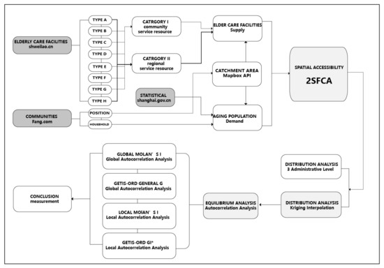 Previous studies on accessibility, with the use of 2SFCA method, mostly set the catchment area as the travel range within a travel time of 0.5–1.5 h [58,59,60]. However, its limited spatial scope impacts the actual accessibility results, covering up the imbalance of accessibility in reality. There are two aspects to consider for community residents: first, older adults living at home can easily access elderly care facilities; secondly, children can easily visit their parents living in elderly care facilities. The 15-min community-life circle is the basic unit for community life in Shanghai. That is, within the range of 15-min walking cost, essential services and public spaces should be provided to form a safe, friendly, and comfortable social living environment [61]. In recent years, the principle of community-life circle issued by the government has set the scope of supply and demand services of public facilities [62]. For example, “Building a diversified and integrated 15-min community life circle” is proposed in the Shanghai Master Plan 2017–2035 [63] and Shanghai Planning Guidance of 15-Minute Community-Life Circle [61]. The goal is to reach about 99% of the coverage of community service facilities in Shanghai within 15 min by 2035. In February 2022, Shanghai Civil Affairs Bureau issued the draft of Planning for the Layout of Shanghai Elderly Care Facilities (2021–2035), which proposed to ensure the full coverage of a 15-min community-life circle of basic care services for older adults and improve the serviceability for key aging groups such as living alone, advanced age, disability, and dementia [64]. Therefore, this paper employed the 15-min community-life circles as the study units. The proposed research framework of this paper is shown in Figure 1.