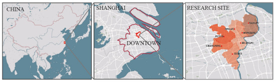 Shanghai is the city with the highest level of urbanization development in China. With the improvement of China’s economic development level and national economic strength, more cities will enter the development stage of Shanghai at this time. Therefore, taking Shanghai as the research site has forward-looking significance. On the other hand, Shanghai has a high degree of urban information construction, with a high degree of information disclosure and easy access to various kinds of information [65,66]. According to the data of Shanghai Statistical Yearbook 2021, Shanghai, the first city entering the aging society in China, has a large population of registered older residents (60 or above years old) of 5,324,100, accounting for 36.08% of the total demographic. The aging problem in downtown Shanghai is even more severe (Huangpu District of 41.7%, Hongkou of 42.5%, Putuo District of 41.1%, Jingan District of 40.1%, Changning District of 39.1%, Yangpu District of 38.8%, and Xuhui District of 35.9%). With the elderly dependency rate increasing year by year, the city has been entering a state of deep aging society [67]. As the population in downtown Shanghai is extremely concentrated, essential service distributions for the highly populated aged community are particularly significant. Therefore, the research scope of this study has focused on the distribution equilibrium of elderly care facilities in the community-life circles in downtown Shanghai. The research site is shown in the Figure 2 below.
