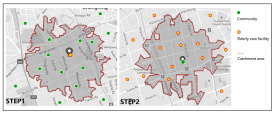 Older adults’ choice of surrounding care services is not limited to the boundaries of administrative regions, and the communities located at the edge of administrative regions may choose care services across administrative boundaries. So, the scope of elderly care facilities obtained in this paper is extended to the surrounding areas of research site. Shanghai elderly care service platform (shweilao.cn, accessed on 20 April 2022) has registered the data of different kinds of elderly care facilities in Shanghai, with various types, complete data, and information authority. Therefore, this study obtains various types of elderly care facilities from this platform. The effective data obtained this time are: nursing home, Type-A (706), providing centralized care services; elderly care home, Type-B (170), providing medium and short-term care services; elderly daycare institution, Type-C (725), providing daycare services; meal aid service point, Type-D (1741), providing catering service for the elderly; community elderly care service organization, Type-E (259), providing door-to-door services; comprehensive services center, Type-F (360); and nursing station, Type-G (168) and nursing hospital, Type-H (54). Since the map coordinates used by this platform are Amap coordinates, coordinate conversion shall be carried out before data cleaning. In order to facilitate the research and take into account the service scope of elderly care facilities, the catchment area is distinguished into 2 categories. As pointed by Yang et al., the catchment size may also vary according to the type of provider and the cost of transportation [69]. Category−I, provide medium and short-term services, whose catchment size is set as a 30-min walking distance (Type-B, -C, -D, -E, -F, and -G); Category−II, provide long-term and comprehensive centralized care services, whose catchment size is set as a 15-min driving distance (Type-A and Type-H). Two categories of catchment area data are obtained from the Mapbox platform.