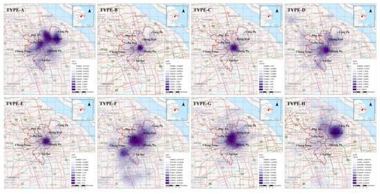 Kernel density diagram of eight types elderly care facilities (Type-A, -B, -C, -D, -E, -F, -G, and -H).