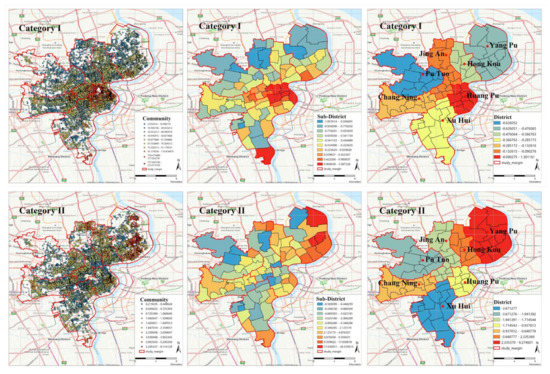 The distribution trend of the accessibility of elderly care facilities in downtown Shanghai is shown in Figure 5. Considering the matching of administrative regions, the research is carried out at the community, sub-district, and district levels, respectively. For Category−I, the high accessibility value at the community level is mainly distributed in the central area of HuangPu District, extending outward in strips. At the sub-district level, it can be seen that the accessibility of seven sub-districts in the north of HuangPu District is the best, and the other Huajing town of Xuhui District also has a high value. At the county level, Huangpu District is the best and PuTuo District is the lowest. It is obvious that the data at the district level has erased the characteristics of internal diversity. Generally speaking, the high accessibility of social resources of Category−I is too concentrated in the communities in the north of Huangpu District. For Category−II, at the community level, the distribution of accessibility values is relatively balanced. At the sub-district level, most sub-districts in Yangpu District have higher accessibility. At the district level, YangPu District has the best accessibility and XuHui has the worst accessibility. The global spatial distribution of Category−II is relatively even.