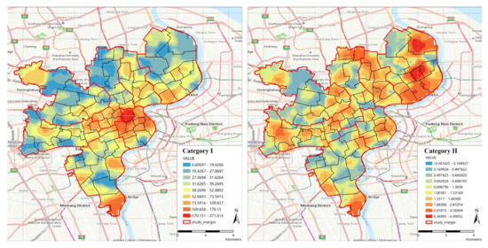 From the Kriging interpolation results (Figure 6), it can be seen that the perspective of administrative region matching cannot show the actual accessibility distribution, covering up the imbalance of facts. For example, for Category−I, the value of HuangPu District is high both at the sub-district and district level, but, most importantly, the highest value appears in the Nanjing East Road sub-district, which radiates outward with it as the center. Without considering the matching of administrative regions, as for the other six sub-districts (which have the same value as Nanjing East Road), there will be no obvious advantage compared to other regions. Moreover, more real features will be obscured at the district level. For Category−II, taking Yangpu District as an example, the high value from the perspective of the sub-district and district level has covered the low-value phenomenon in some areas in the East Yangpu District. If the distance to the elder care facility is long, people could consider moving to a location where the facility is situated nearer [87], which will aggravate the run-on pension resources and cause a greater waste of resources.