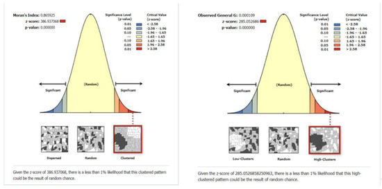 In order to analyze the spatial distribution characteristics of elderly care facilities, this paper uses spatial autocorrelation tools to study the resource distribution. Spatial autocorrelation can be used to detect three spatial data distribution modes—clustering, dispersed, and random—which can be divided into global autocorrelation (Global Moran’s I, Getis-Ord General G) and local autocorrelation (local indicator of spatial autocorrelation (LISA), Getis-Ord Gi*tool). Global Moran’s I generally reflects the spatial autocorrelation of the study area, which is used to judge whether there is spatial autocorrelation in the whole, and the Getis-Ord General G method was used to preliminarily judge the agglomeration type [85].