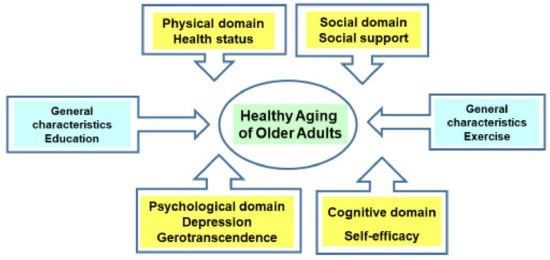 Next, considering healthy aging in the cognitive/mental aspects of the elderly, depression, gerotranscendence, and self-efficacy were included as variables. When the degree of depression of the elderly was higher, the quality of life was lowered, and cognitive impairment could be caused in older adults with high depression [15]. If the degree of depression was high, it was difficult to fully conserve the health of the elderly [10,12]. As depression showed a negative correlation with the quality of life of older adults with chronic diseases living in the community [9], depression might play a negative role in the maintenance of healthy old age of older adults, so depression was included, as there should be efforts to reduce it. Gerotranscendence showed a positive correlation with the successful aging of older adults, so when the transcendence was higher, aging was performed successfully [11]. Thus, older adults who experienced gerotranscendence perceived aging as a normal human growth/development process and naturally accept the changes of aging [16], so they could experience such healthy aging. The self-efficacy of the elderly showed a positive correlation with quality of life as a main factor affecting quality of life [9]. In the results of a conducted meta-analysis on the variables related to successful aging of Korean people, self-efficacy was included as a psychological variable [17] and had great effects on successful aging of the elderly, so raising self-efficacy would be a very important variable in achieving healthy aging.
