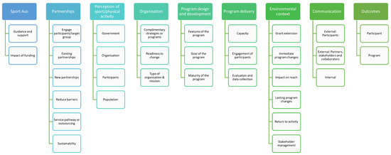 All audio recordings of the qualitative interviews were transcribed verbatim for analysis by a professional transcription company (Way With Words). Framework Analysis was deemed an appropriate approach to analyse qualitative data due to the systematic nature of the semi-structured interviews [19]. Interview transcriptions were analysed using the Framework Analysis approach in NVivo software (NVivo 12 Plus). Once familiarised with the transcripts, the research team conducted an iterative process that identified codes and sub-codes within the interviews to form a thematic scheme of the data (Figure 1). The RE-AIM framework was applied to the coded themes to understand the areas in which the grant programs were successful, or could be improved, in achieving the aims of the funding.