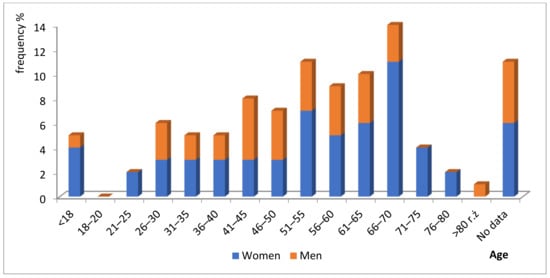 The statistical analysis of the examined cases enabled establishing that in 62% they concerned women. Only 38% were events which applied to men. Age categories of patients divided by sex were presented in Figure 2. Unfortunately, in 11% of cases, there was no information on this subject. In accordance with the “Safe Hospital Safe Patient” report by the Centre for Monitoring of Quality in Healthcare of 2014 [], a hypothesis was presented that women care for their health more than men. That is why they more frequently receive medical services, which increases the risk of the occurrence of an adverse event during treatment. Additionally, women are characterised by a lower tolerance for treatment failure, which results in a higher share of women among patients seeking compensation through court proceedings. It may be simultaneously conjectured (although there was no such analysis conducted in this study) that women, being better educated, have more knowledge of patient rights, and also of the obligations of medical entities. Thus, they may have a higher awareness of the possible compensation/damages for incorrect treatment and a belief that they are entitled to it.