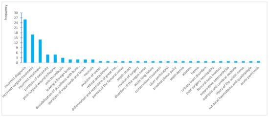 Data concerning the type of adverse events to which the compensation claims applied were also analysed. Due to the diversity, they were grouped into 32 more general categories (Figure 4). The most frequent events included those related to incorrect diagnosis (the lack of correct diagnosis), which resulted in appropriate activities not being undertaken and a lack of appropriate treatment, e.g., lack of diagnosis of cancer, myocardial infarction, appendicitis, or fracture (26%). The next one was incorrect surgical treatment (17%)—the consequence of which was most frequently a need for repeated surgery and an incorrect conservative treatment of injuries (14%).