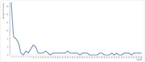 The next step was an assessment of examined cases for the interval between hospitalisation/stay as a result of the primary disease, and the commencement of the treatment of the consequences of an adverse event—the “secondary harm” (Figure 5). For all analysed cases, the average time was 109.79 days (10 weeks), the median was 37.5 days (6 weeks), and the mode was 1 day (8%). At the same time, the maximum time amounted to 2010 days (288 weeks) and concerned a patient for whom it was necessary to perform a heart transplant surgery due to the lack of correct diagnosis and the lack of implementation of correct treatment. The patient has also a permanently issued disability certificate. It should be noted here that a disability certificate was issued for 18% of cases, in 6% of cases a consequence of the event was the death of the injured party, and for 5% of cases the treatment was not finished until today.