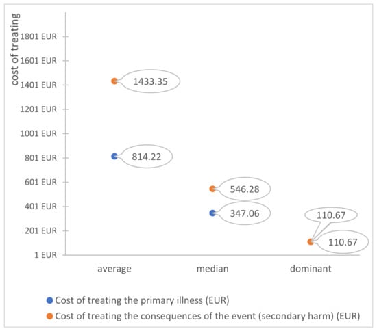 The average, mode, and median of the costs of treatment, both primary and secondary, are presented in Figure 6. It can be clearly seen that the average cost of treatment of the consequences of adverse events are almost twice as high compared to the primary disease. The medical entities thus spend more funds on “restorative” actions, which constitute an attempt to protect against the negative consequences of wrong decisions or actions, than on the primary treatment. The presented amounts are also a burden for the entire healthcare system, which instead of focusing on appropriate treatment must finance additional corrective services (e.g., repeated surgeries, rehabilitation) not related to the primary illness.