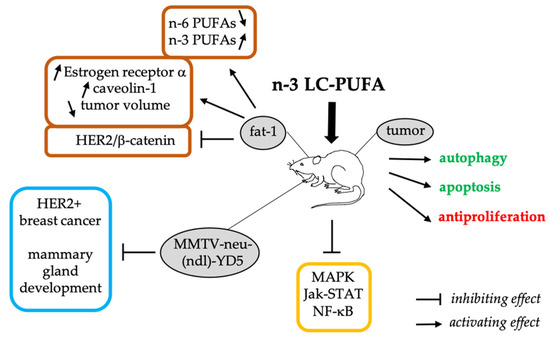 The influence of lifelong exposure to various dietary fats on mammary tumor development was investigated by using the mouse mammary tumor virus MMTV-neu(ndl)-YD5 model, which is a murine equivalent to human HER2+ breast cancer, over a 20-week period [43]. The results highlighted the influence of diet on mammary tumor outcome, and specifically showed that the occurrence of HER2+ breast cancer is attenuated by the consumption of n-3 polyunsaturated, saturated, and monounsaturated fatty acids compared to n-6 polyunsaturated fatty acids [43] (Figure 2). Previously, the same group had shown the beneficial effect of n-3 LC-PUFAs in reducing the risk of breast cancer by altering the early development of the mammary gland. Indeed, they showed that fat-1 mice had increased expression of ERα and caveolin-1 (2-fold and 1.5-fold, respectively) compared to wild-type mice [44]. Similarly, a comparison between the offspring of wild-type mice and fat-1 mice fed an n-6 PUFA diet during pregnancy showed that wild-genotype offspring of fat-1 mothers had lower tumor incidence and smaller tumor volume compared with wild-genotype offspring of wild-type mothers [45]. Moreover, this study showed that n-3 LC-PUFAs in mothers altered the expression of several long noncoding RNA (lncRNA) and signaling pathways (i.e., MAPK, Jak-STAT, and NF-κB) in the mammary gland of offspring [45]. These results, and similar ones obtained with wild-type C57BL/6J mice or transgenic C3(1) Tag mice, highlighted the influence of the mother’s diet on the occurrence and development of breast cancer in her offspring [45,46,47,48]. The molecular mechanisms of this protective effect of n-3 LC-PUFAs are still poorly understood, but a recent study has shown the involvement of gut microbiota restructuring as a mechanism of maternal n-3 LC-PUFAs’ protective effect against mammary tumors in offspring [47].