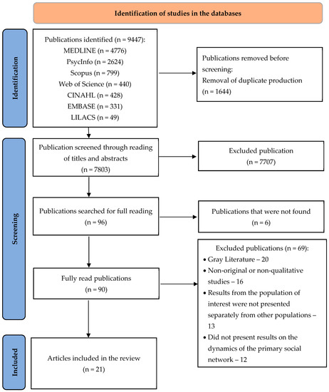 Additionally, original qualitative articles, in all languages, that dealt with the dynamics of primary social networks through experiences verbalized by mothers, fathers, or guardians of transgender children and/or adolescents were included. Duplicate publications, gray literature (abstracts published in proceedings, newspaper news, dissertations, theses, book chapters, letter to the editor, preprint publications) and studies with results regarding the population of interest which were not presented separately from other populations were excluded.